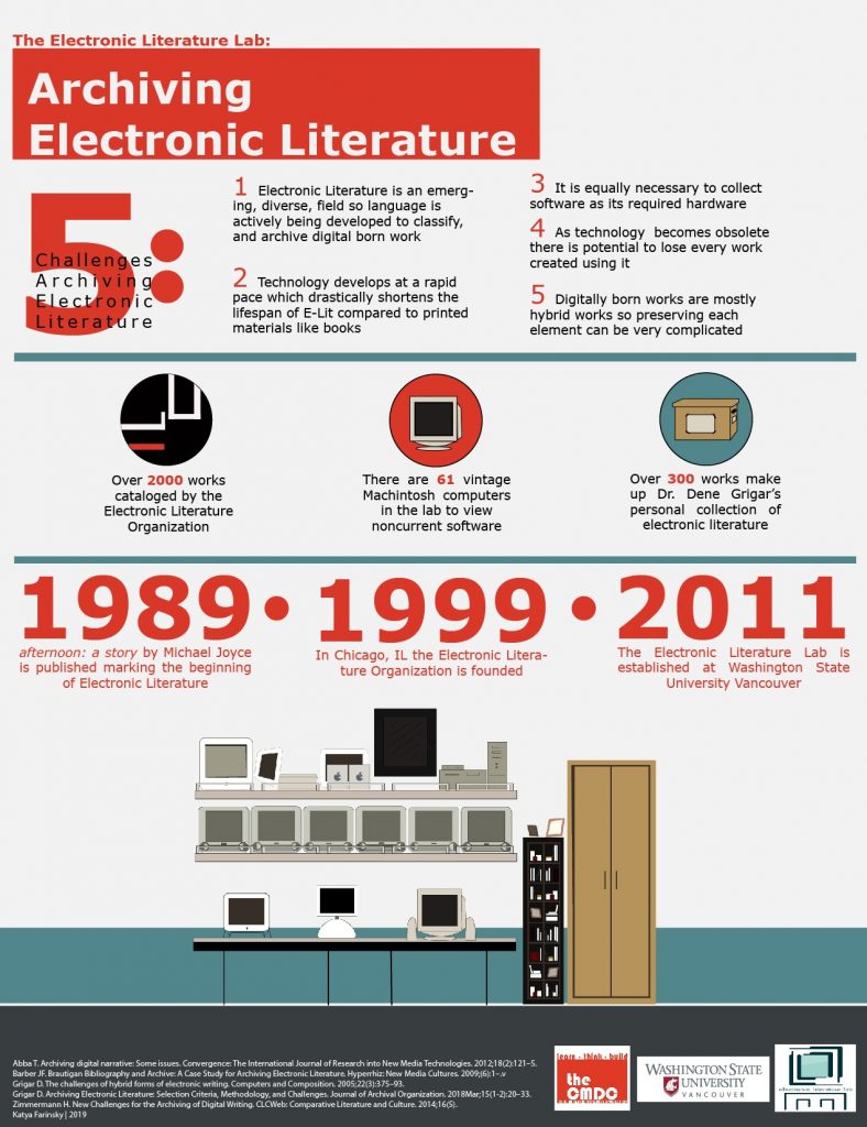 Flat graphics created to highlight the Electronic Literature Lab at WSU Vancouver and its important role in preserving born digital literary work.