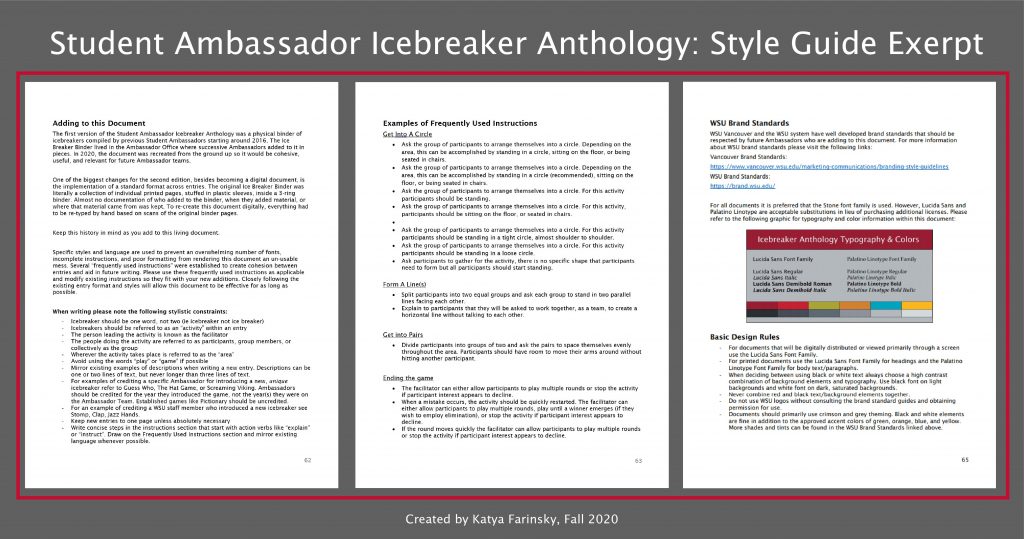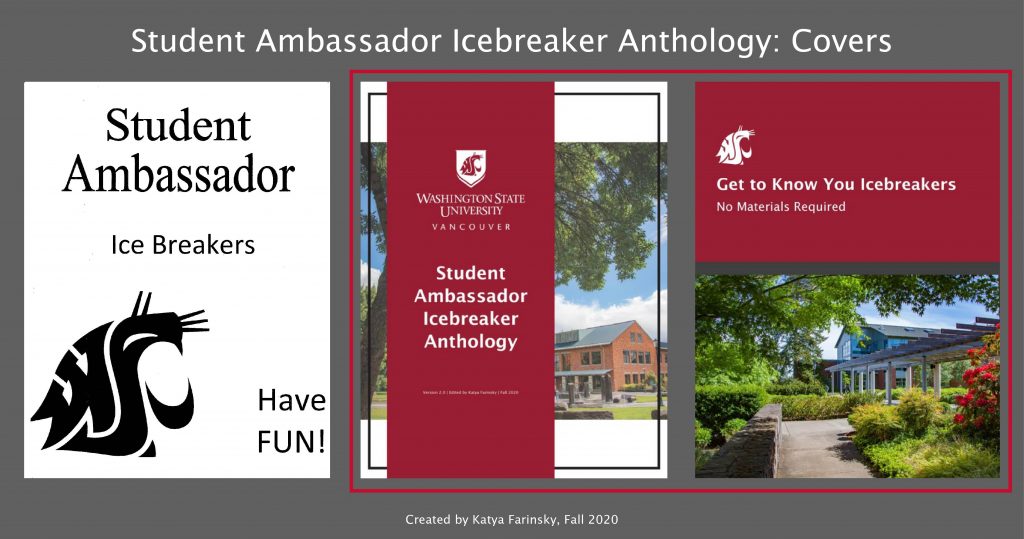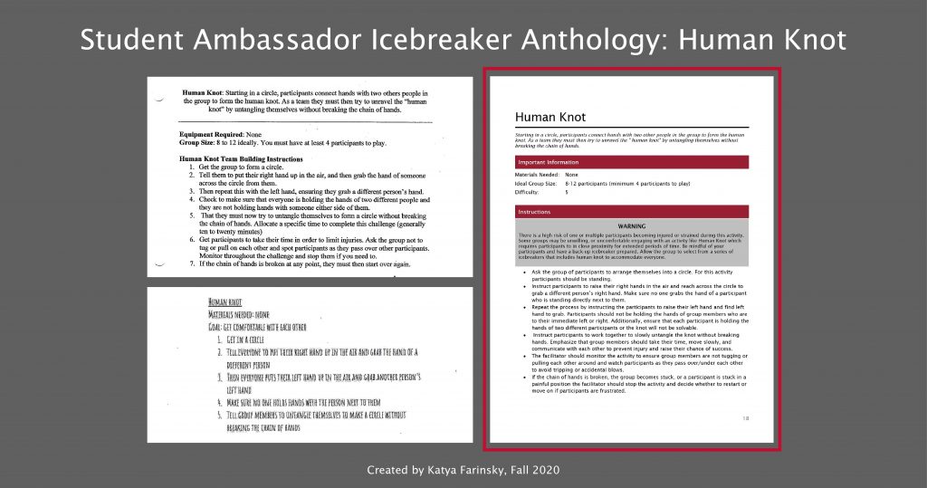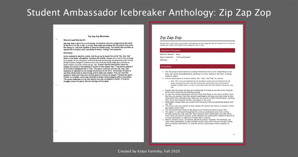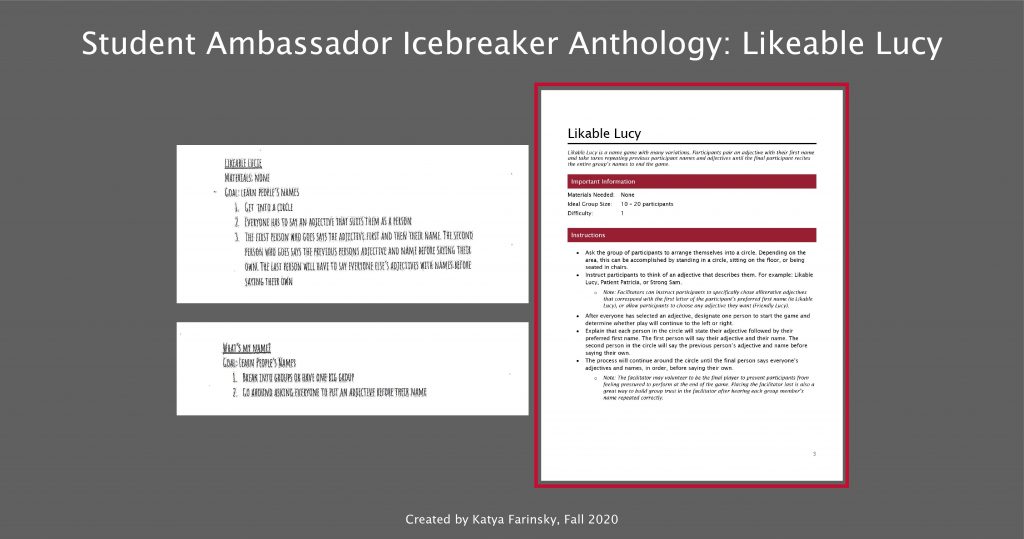 The Student Ambassador Team uses icebreakers during summer training, ROAR New Student Orientations, and other events on campus. An informal list of favorites emerged over the years, but nothing was written down until the creation of the Ice Breaker Binder which appears to originate in 2016. Student Ambassadors haphazardly added printed pages to a physical binder without retaining working files, version documentation, or any sense of cohesion.