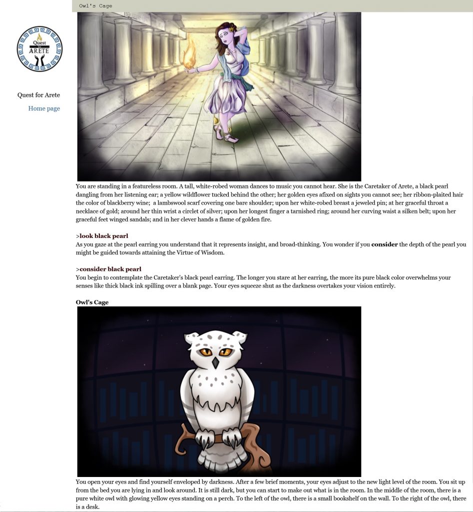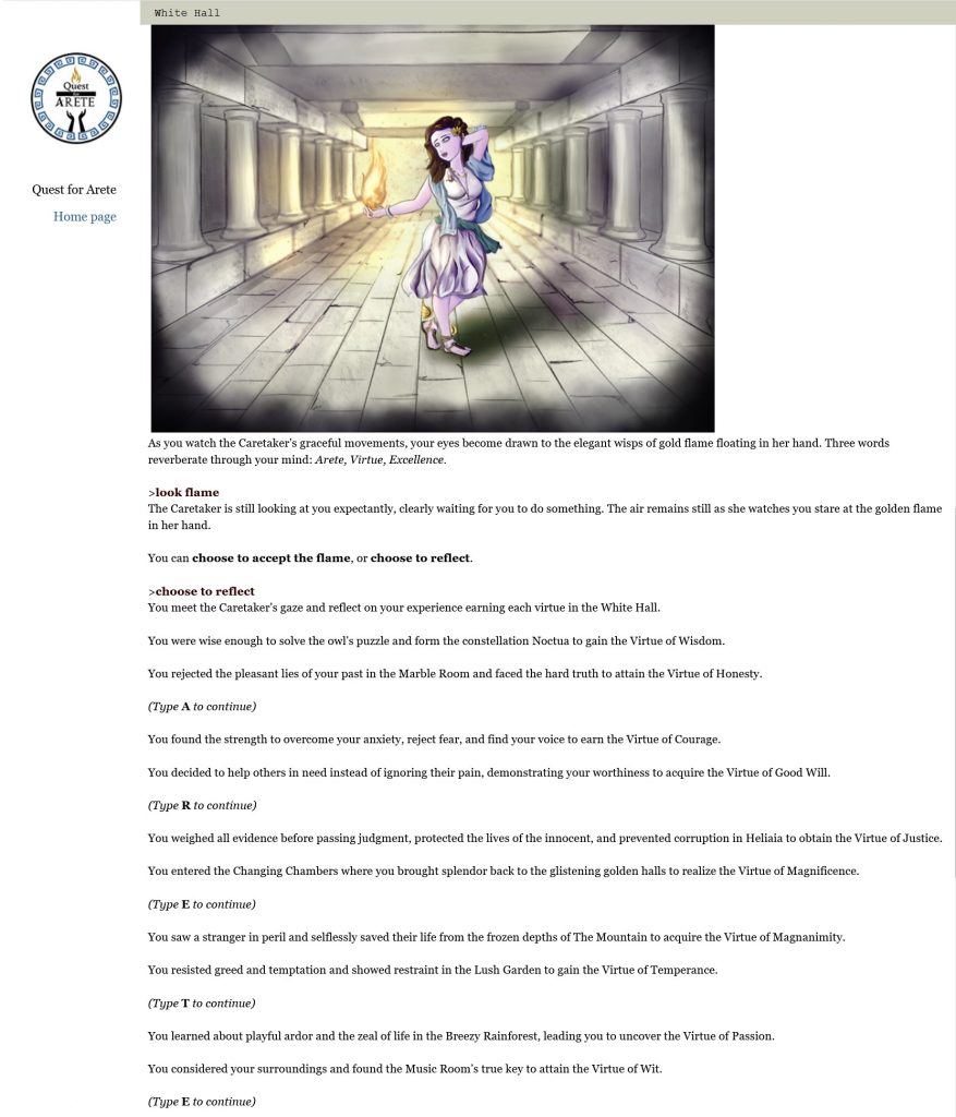 Quest for Arete is a game produced on the Inform 7 platform that explores the use of Interactive Fiction to tell one story, over 10 episodes, to foster understanding of social justice and ethical living. As a Game for Change, Quest for Arete challenges users to think about attributes like honesty, magnanimity, and temperance to promote personal growth through meaningful engagement with each virtue.