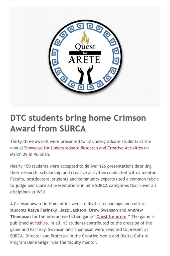The game was produced by students in the Fall 2020 Video Game Theories and History class offered by the CMDC Program at WSU Vancouver. It was enhanced for AdvXJam by 13 of these students who published Version 2.0 of Quest for Arete on the itch.io game platform. In addition to producing the game, the students created a logo, trailer, 3D animated logo, hand-coded project site with a walkthrough to assist new users, and art to complement the game’s rich language and complex game mechanics.