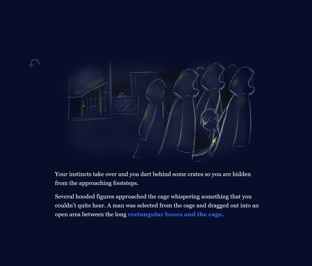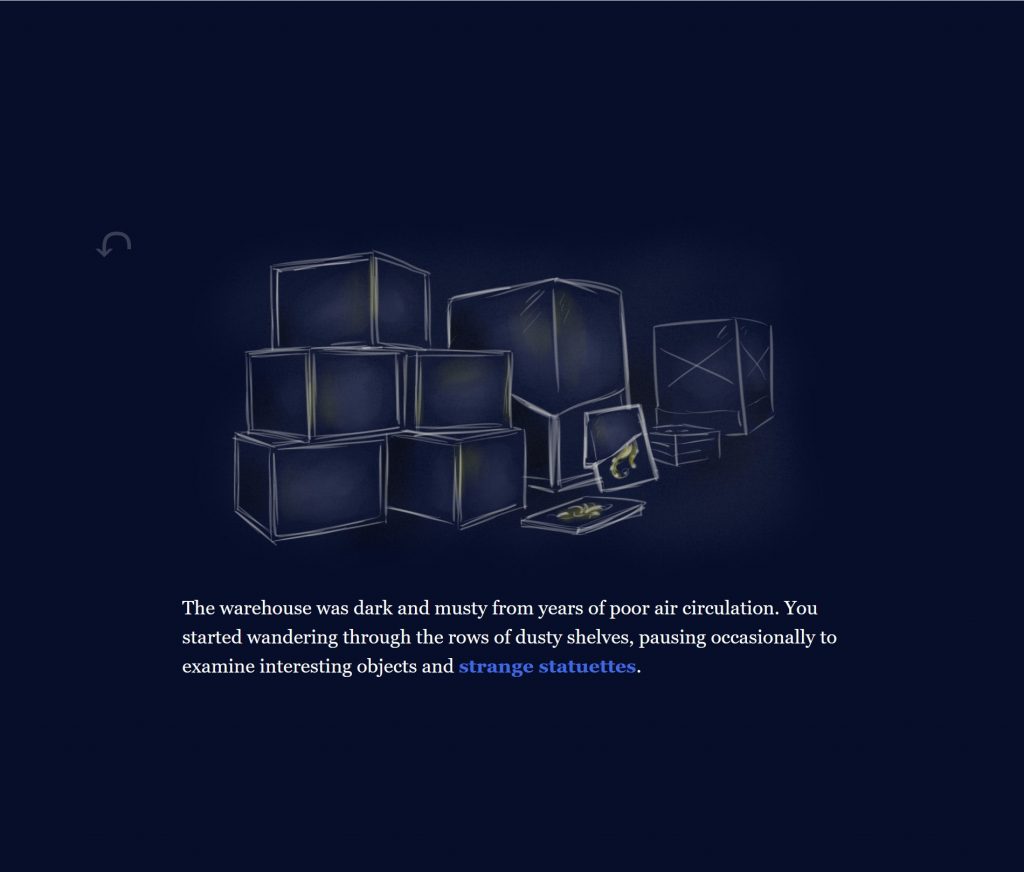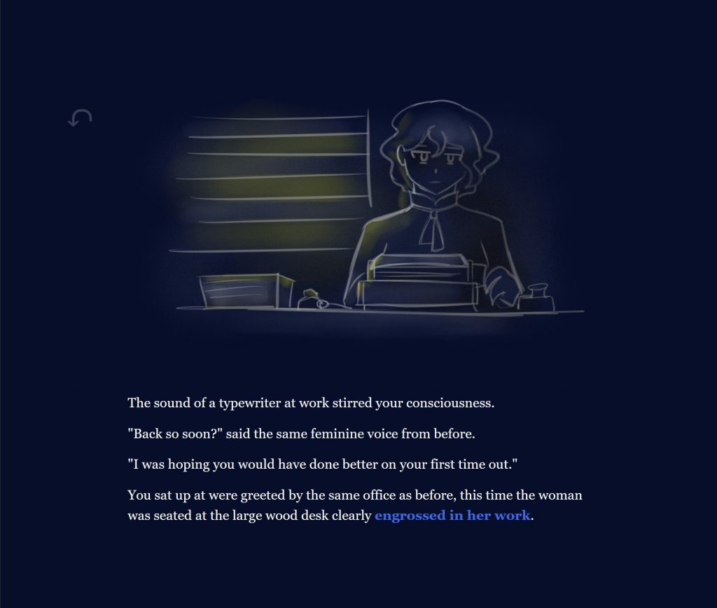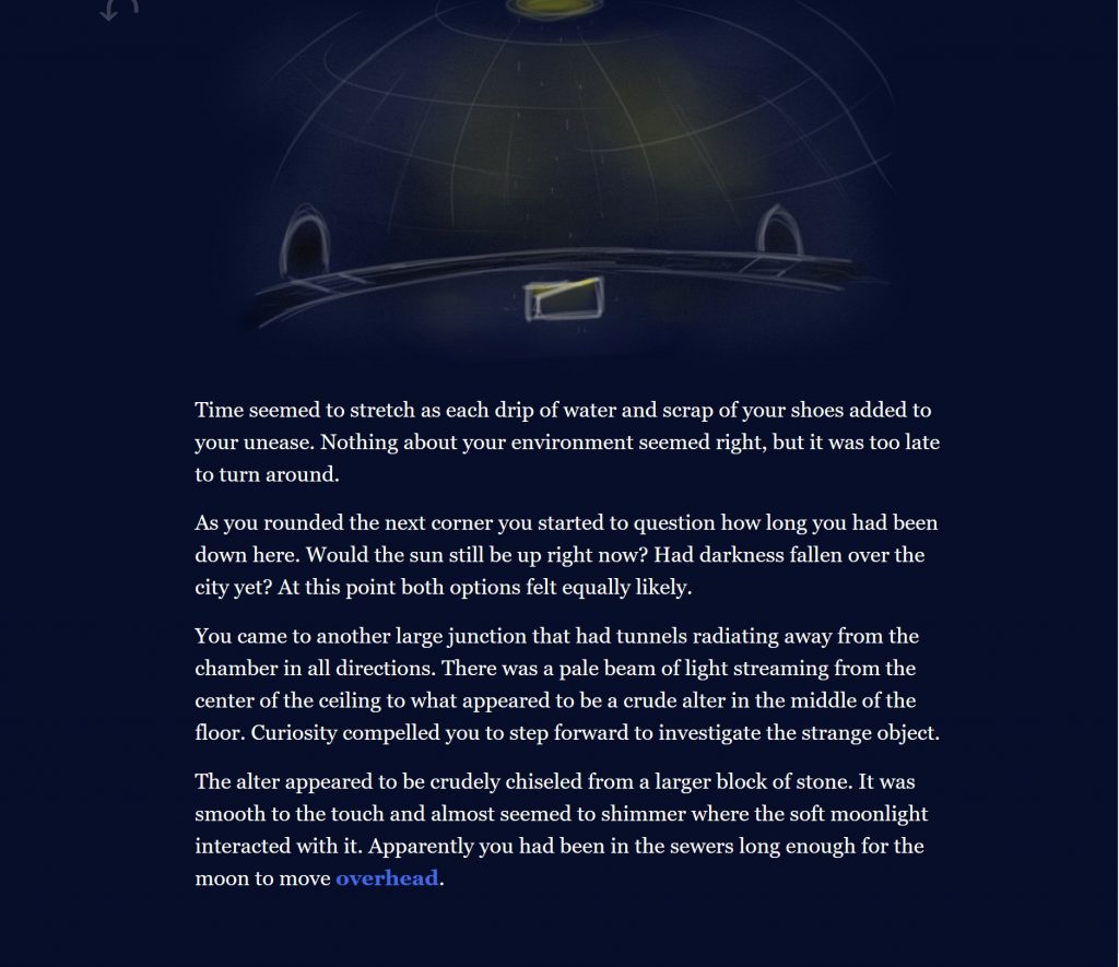 Elyse and I developed The Drowning City from a short story concept she previously created. We collaborated on every aspect of this project, though I primarily focused on expanding the narrative with her input and Elyse created all the original artwork with occasional input from me. Our hypertext story was featured in the Spring 2020 Twine Stories Exhibition and is currently playable in browser.
