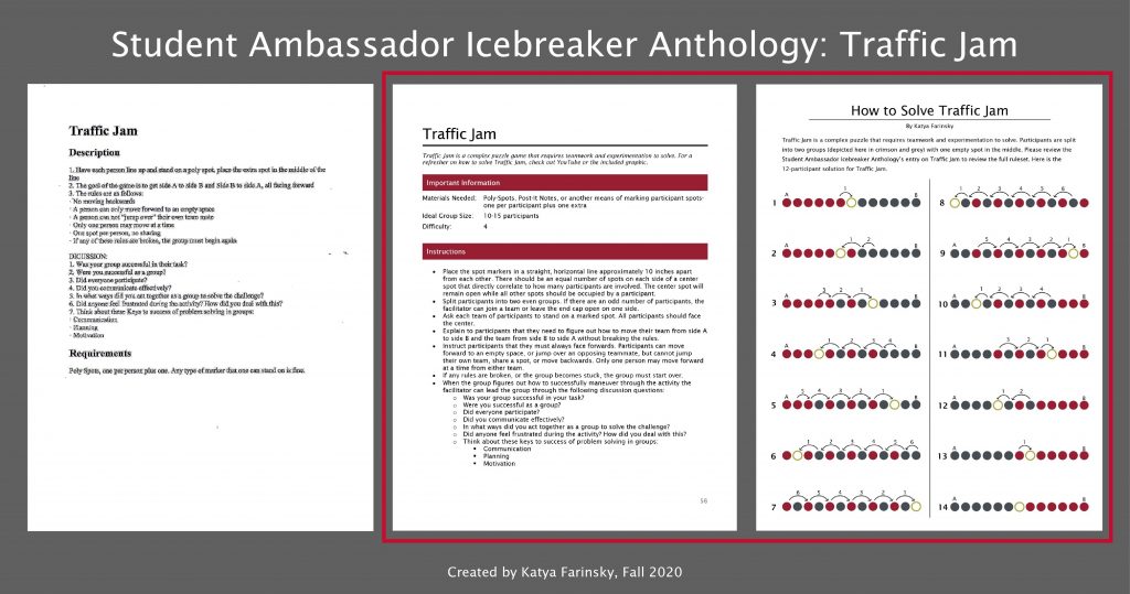 The Student Ambassador Team uses icebreakers during summer training, ROAR New Student Orientations, and other events on campus. An informal list of favorites emerged over the years, but nothing was written down until the creation of the Ice Breaker Binder which appears to originate in 2016. Student Ambassadors haphazardly added printed pages to a physical binder without retaining working files, version documentation, or any sense of cohesion.