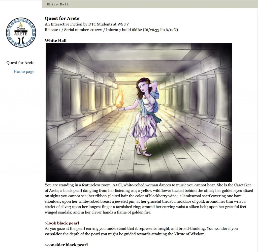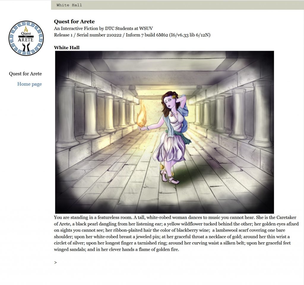 The game was produced by students in the Fall 2020 Video Game Theories and History class offered by the CMDC Program at WSU Vancouver. It was enhanced for AdvXJam by 13 of these students who published Version 2.0 of Quest for Arete on the itch.io game platform. In addition to producing the game, the students created a logo, trailer, 3D animated logo, hand-coded project site with a walkthrough to assist new users, and art to complement the game’s rich language and complex game mechanics.