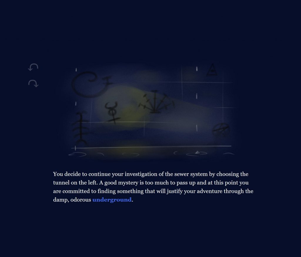 Elyse and I developed The Drowning City from a short story concept she previously created. We collaborated on every aspect of this project, though I primarily focused on expanding the narrative with her input and Elyse created all the original artwork with occasional input from me. Our hypertext story was featured in the Spring 2020 Twine Stories Exhibition and is currently playable in browser.